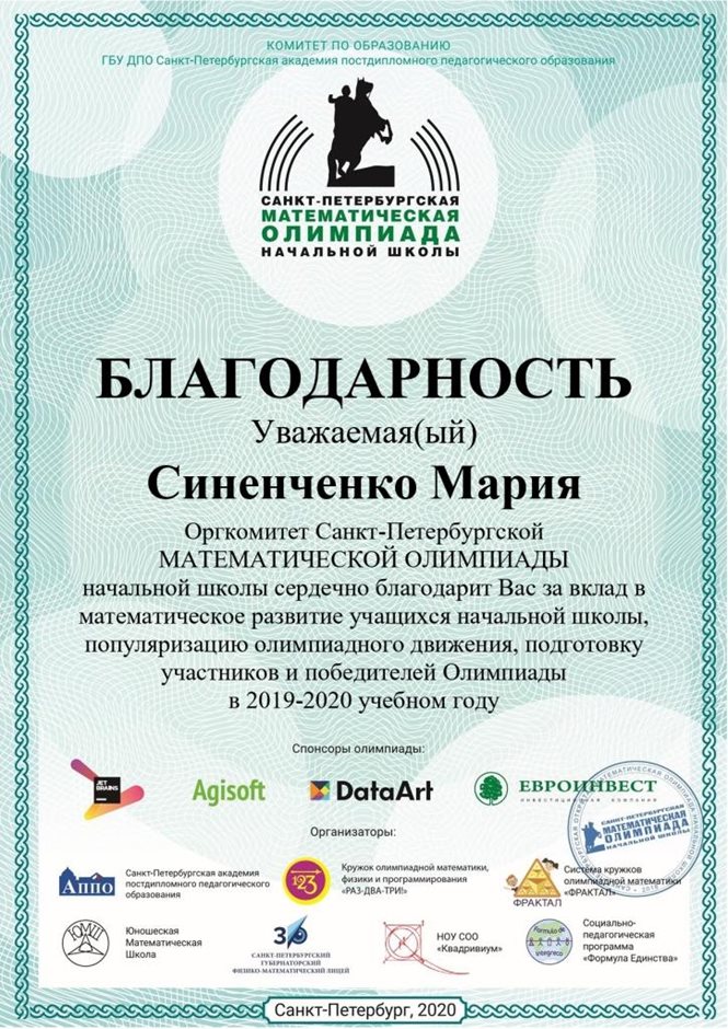 Грамоты, дипломы, сертификаты и благодарственные письма СИНЕНЧЕНКО МАРИИ АЛЕКСЕЕВНЫ