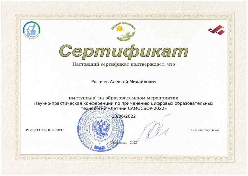 - СЕРТИФИКАТ о выступлении на образовательном мероприятии научно-практической конференции по применению цифровых образовательных технологий "Летний САМОСБОР-2022".