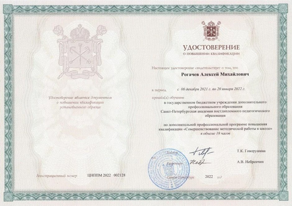 - УДОСТОВЕРЕНИЕ о повышении квалификации в ГБУ дополнительного профессионального образования СПб академия постдипломного педагогического образования по программе "Совершенствование методической работы в школе".