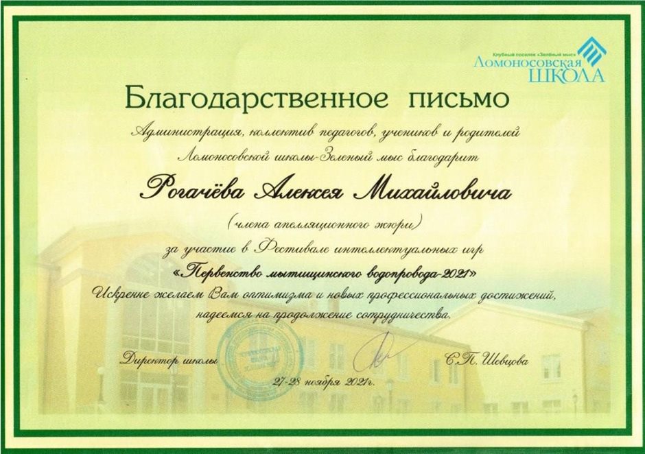 - БЛАГОДАРСТВЕННОЕ ПИСЬМО от Ломоносовской школы за участие в Фестивале интеллектуальных игр "Первенство мытищинского водопровода - 2021".