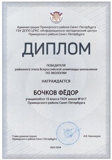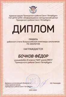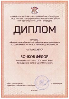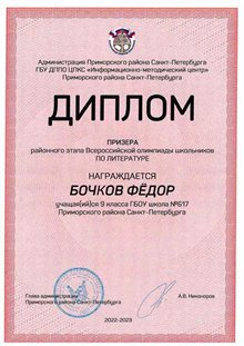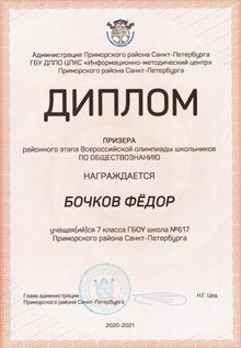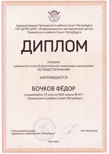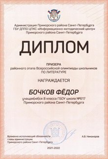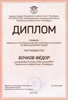 В 2023 году по результатам обучения в основной школе получил аттестат с отличием. На ЕГЭ-2025 Бочков Фёдор получил высокобалльные результаты по Русскому языку - 94, по Информатике - 90, по Математике - 84.