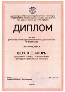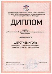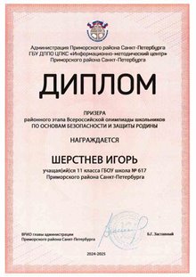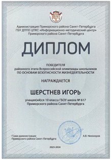 Кроме того, имеет дипломы районного этапа ВсОШ по ОБЖ, ОБЗР, Экономике, Английскому языку, Экологии. В составе команды школы победил в "Экотоне" ИТМО.